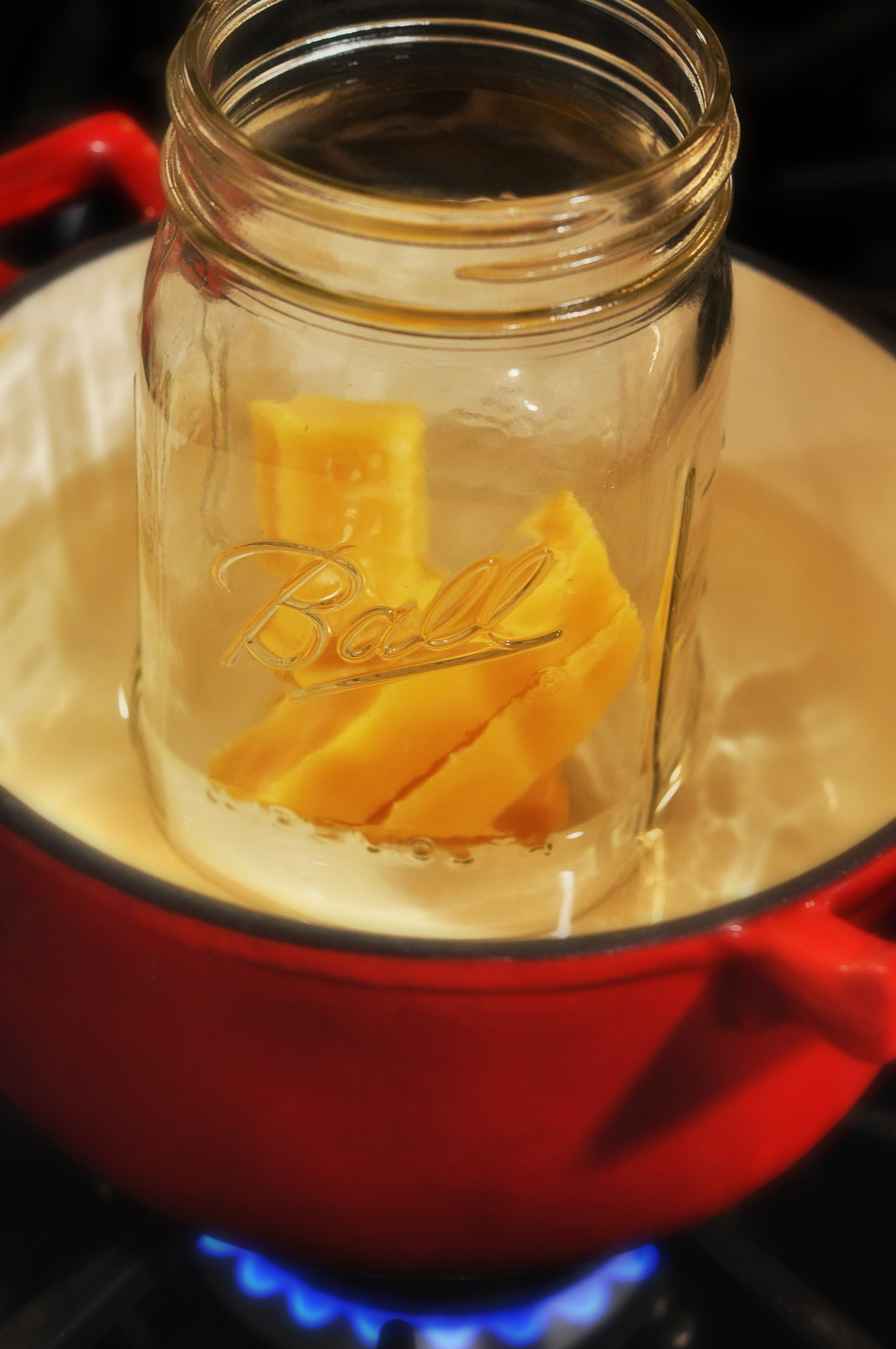 Once all the wax has melted, carefully remove the jar from the saucepan and set it aside making sure to place a dish towel or pot holder under the bottom of the jar before setting it down. Set the jar of mineral oil into the simmering water until it has warmed a bit.