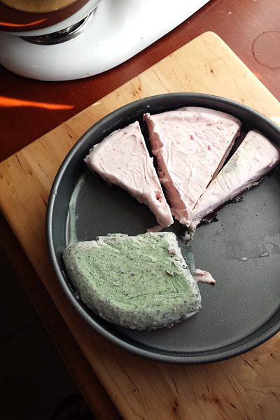 When ready to serve, remove the pan from the freezer and uncover the top.  Grab the ends of the plastic wrap hanging over the cake pan like a sling and use them to pull the cake out of the pan.  Transfer the cake to a large serving plate, removing the plastic wrap from the bottom, and allow to thaw slightly before slicing and serving.