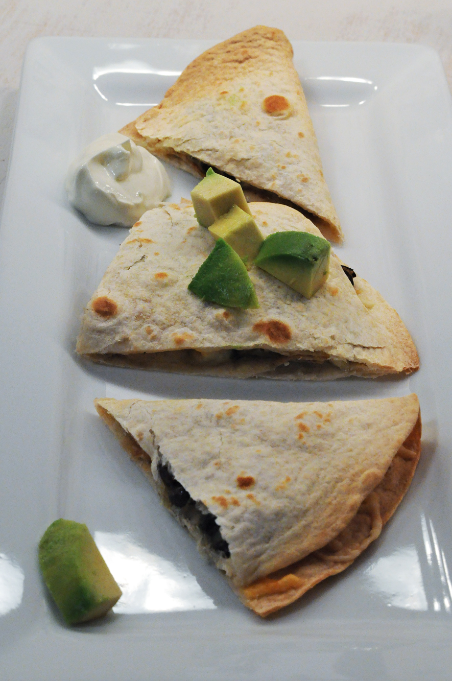 What can I say?  This recipe meets all my bonus point criteria.  In addition to black beans it has zucchini, cheese, sour cream, and avocado.  And it’s also crowd friendly since you finish the quesadillas off in the oven, letting you make a bunch at once.